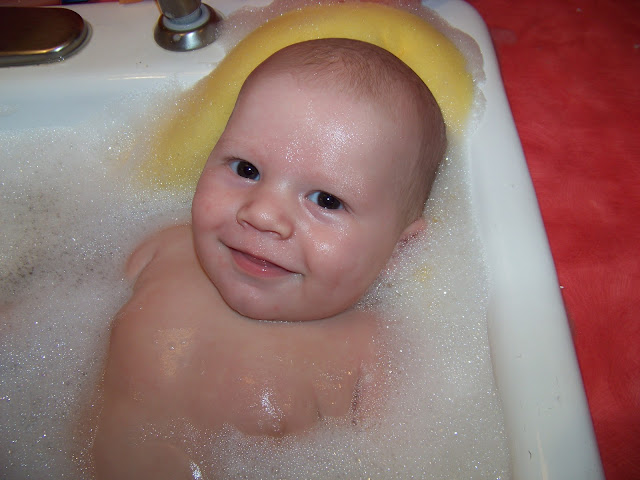At 2 months old, Josiah weighs 15 lbs. and 10 oz and is 24" long. He is still nursing and I just gotta say that this whole nursing business is hard work. Not only does Josiah seem to be hungry every 2 hours during the day, he also wants to use me as a pacifier pretty much all the time. So he is pretty much attached to me all day long. It's exhausting but we get a lot of bonding time in together which is so sweet.